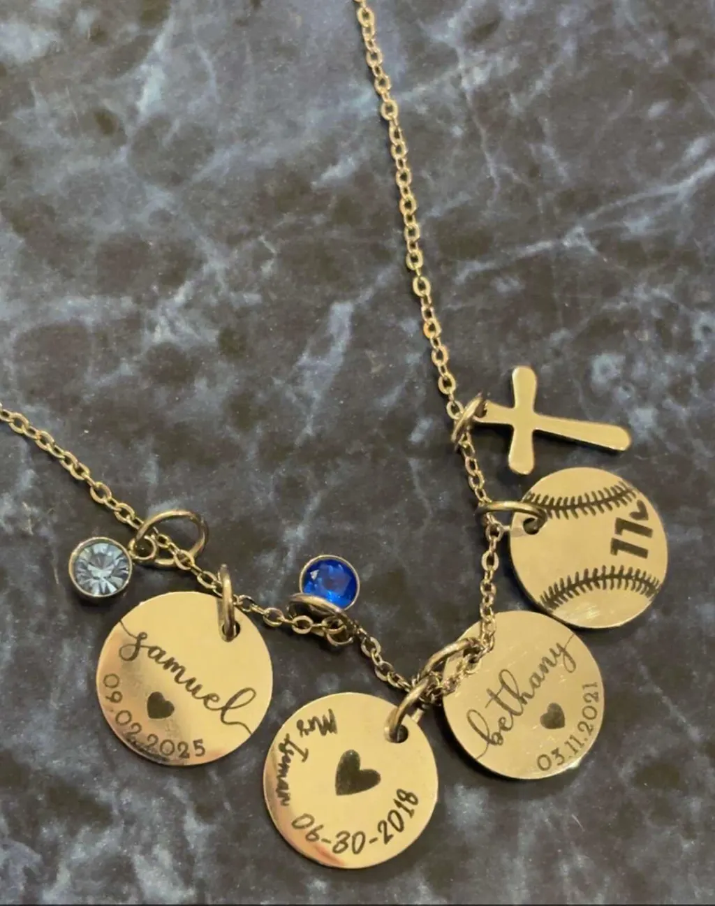 This personalized Necklace is a perfect fit for YOU! Available in silver, gold, or rose gold, it features your kid's or grandkid's names and birthdates.